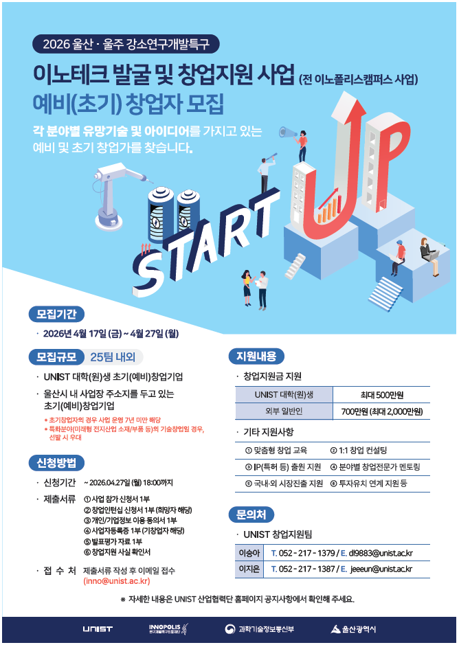 울산과학기술원 산학협력단에서는 [2026 이노테크 발굴 및 창업지원(울산·울주)] 사업에 참여할 유망한 창업아이디어와 아이템을 보유한 예비창업자, 초기창업자를 모집하고 있습니다.