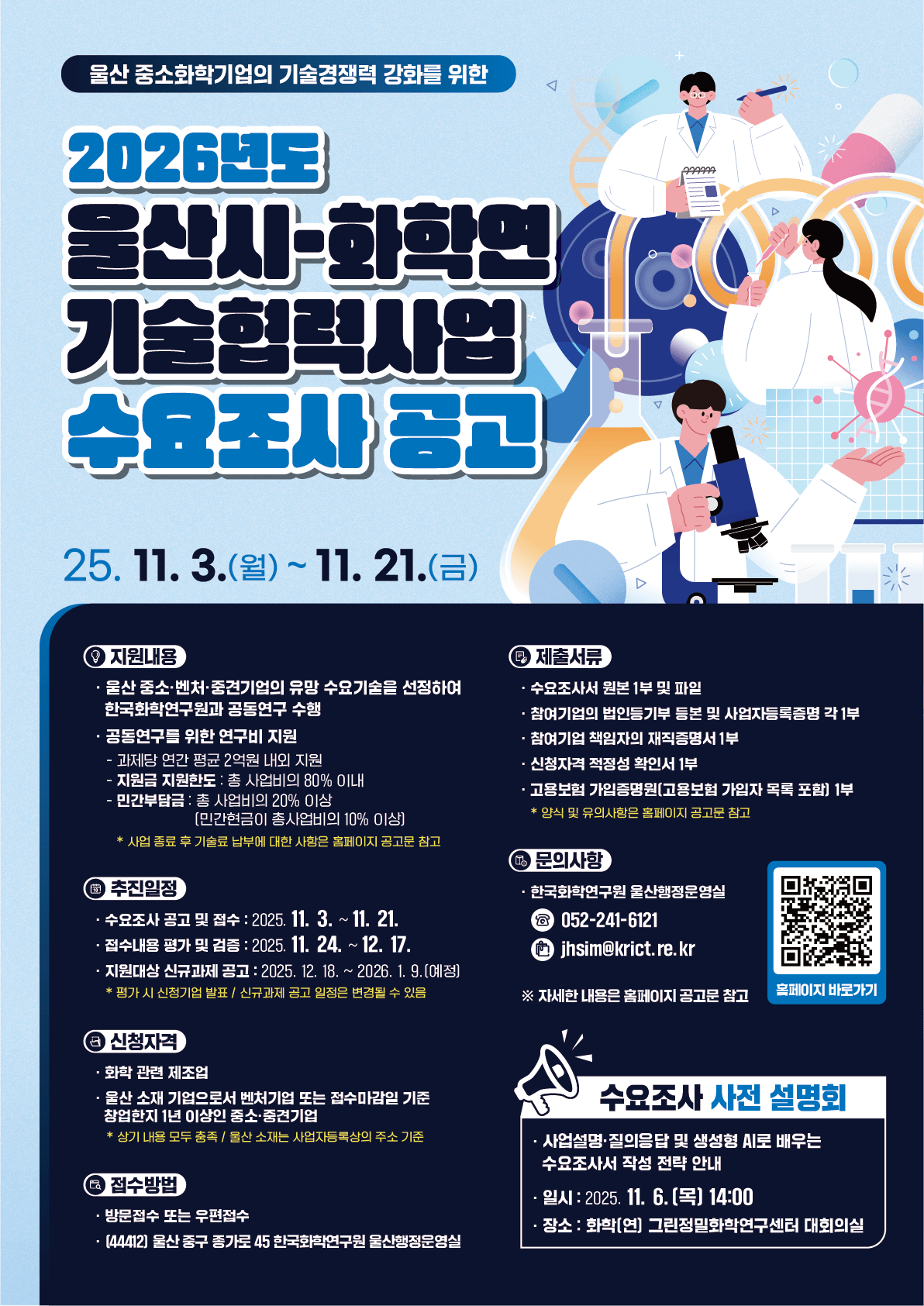 공지사항 [한국화학연구원] 2026년도 울산시-화학연 기술협력사업 수요조사 공고 11Hits administrator2025.11.03 화학연구원 관련 게시물 링크 Download 2.-수요조사서-양식.zip 1.-2026년도-울산광역시-한국화학연구원-기술협력사업-수요조사-공고문.hwp Previous No Post Next (창업) 실험실창업혁신단 스타트업 성장을 위한 법률자문 지원 프로그램 List